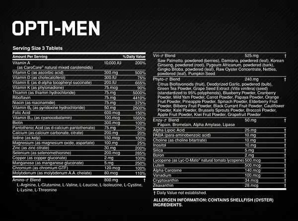 Opti-Men aporta todos los nutrientes que el organismo de un hombre necesita para mantener y reforzar su salud. Opti-Men ha sido especialmente desarrollado para cubrir las necesidades nutricionales de deportistas que poseen un alto desgaste físico y mental. Lo que asegura su efectividad y óptimos resultados en todo hombre.